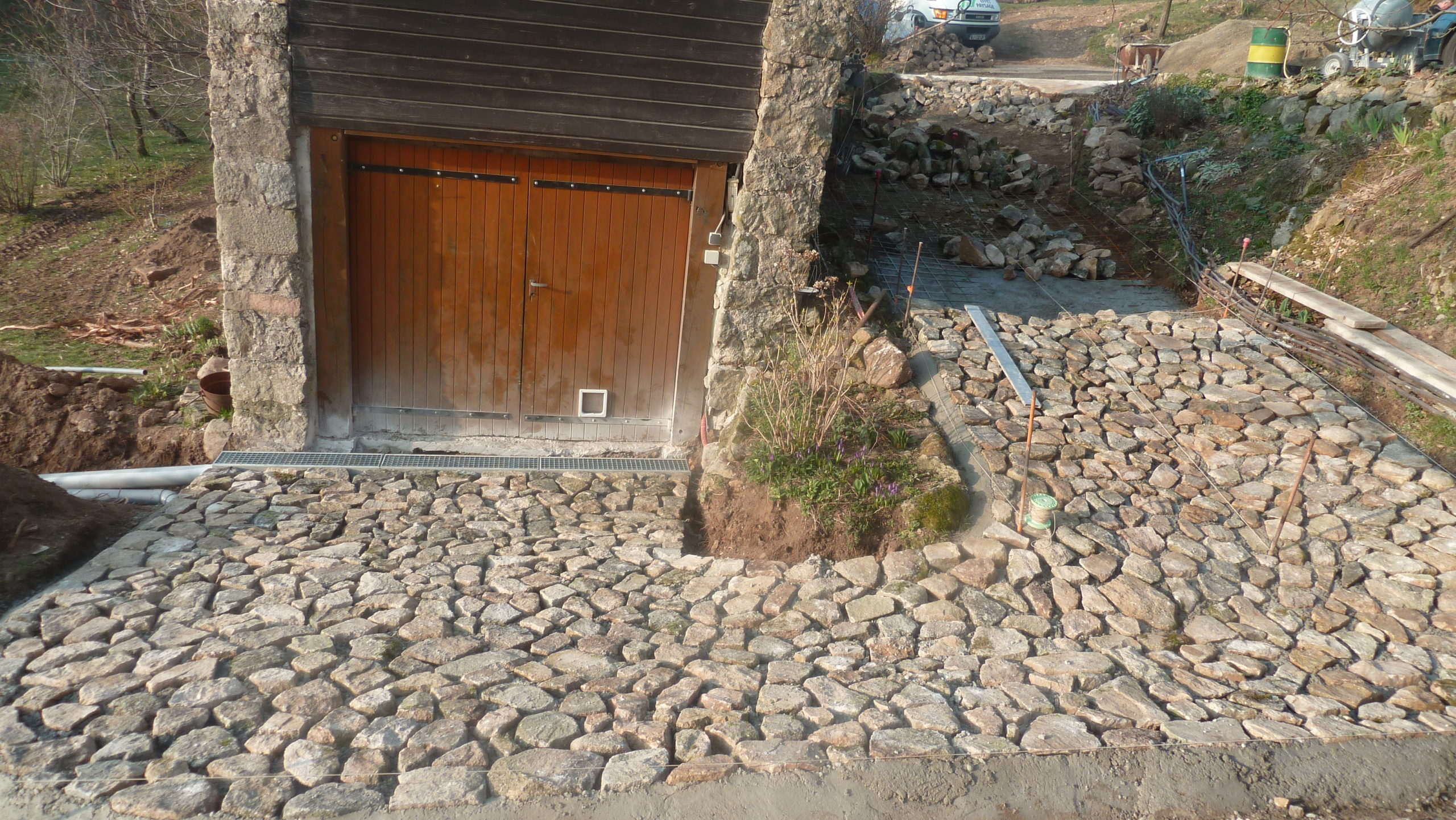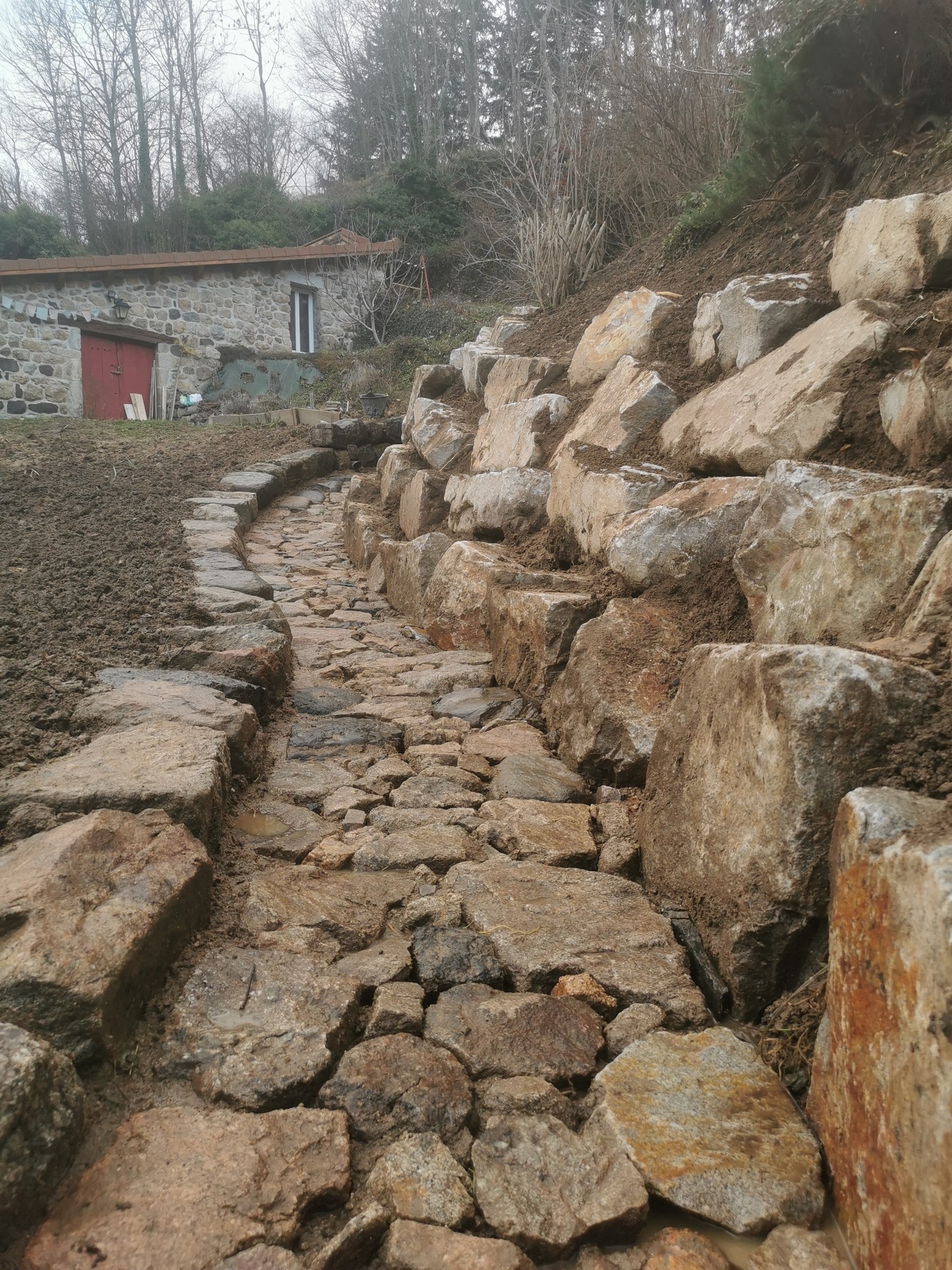 Calade et chemin pavé au Cheylard, dans les Boutières et la vallée de l’Eyrieux – Aménagements paysagers en pierre