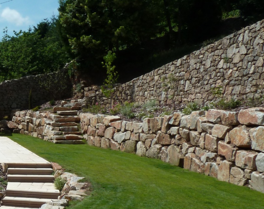 Maçonnerie paysagère : murets en pierre ou bois, murs de soutènement, terrasses, dallages, pavages, escaliers, plages de piscine…
